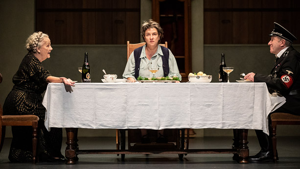 André Marcon campe un juge qui sous ses airs de respectabilité est un dangereux nazi totalement fou avec brio. Catherine Hiegel, avec une énergie débordante, porte cette histoire familiale au paroxysme. Elle incarne la méchanceté avec un naturel époustouflant. Mais celle qui nous terrifie par sa présence et son regard qui vous pétrifie, c’est Noémie Lvovsky, immobile ou presque dans son fauteuil, quasiment silencieuse tout le long de la pièce et pourtant sa présence pèse dans cette maison pour juger son frère et sa sœur. On n’aime pas être jugé par ces yeux là et d’ailleurs les deux autres le lui font savoir avec moults vannes balancées d’un air détaché. L’ambiance est tellement nauséabonde lors de cette soirée qu’on en ressort en se posant des questions sur les tourments de ces âmes.