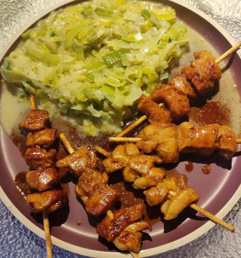 Dans une poêle, faites chauffer un filet d’huile d’olive, faites revenir les brochettes en les retournant régulièrement pendant 5 minutes. A chaque retournement arrosez avec de la sauce. Puis versez le reste de la sauce sur les brochettes et laissez réduire en arrosant les brochettes.