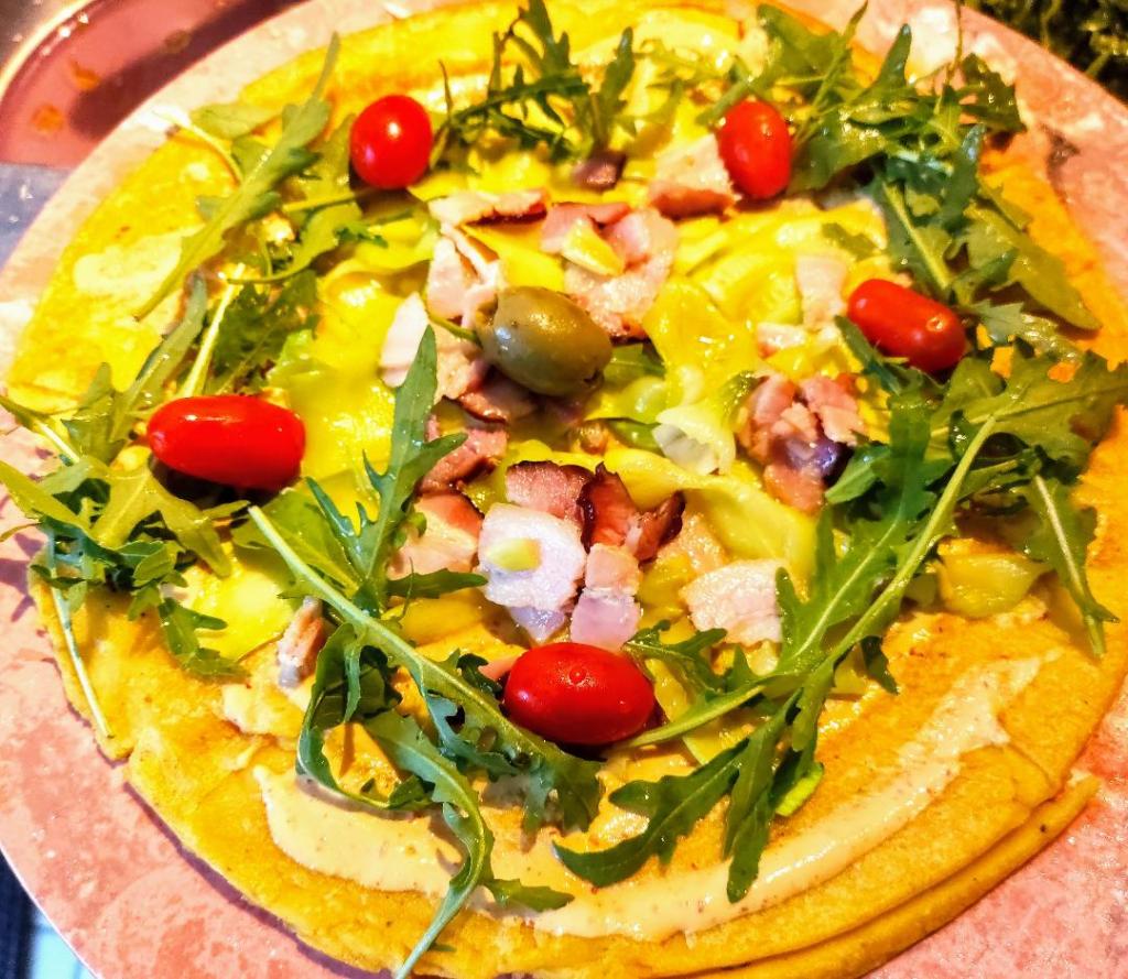 Dressez vos soccas dans des assiettes, tartinez les avec la sauce au yaourt puis ajoutez le mélange courgette/ lard, parsemez de tomates et d’un peu de roquette.
