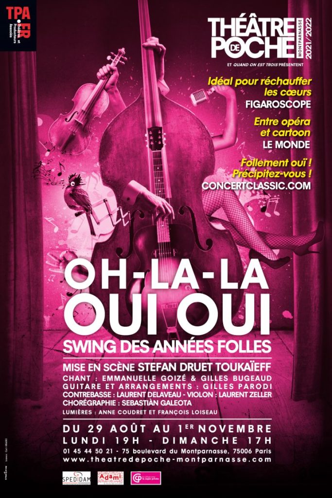 Ah les cabarets du Poche, c’est toujours un plaisir ! Et le nouveau ‘Oh-la-la oui oui’ ne fait pas exception à la règle. Cette fois ci, nous partons en exploration des années folles à Paris. Pour cela, Stefan Druet Toukaïeff a réuni un trio swing jazz et deux chanteurs lyriques pour évoquer cette période aux chansons insouciantes, désuètes et un brin coquinou. Ces chansons qui ont fait swinguer le Paris de la belle époque de Joséphine Baker et Mistinguett. Stefan Druet Toukaieff a pris pour cette session rythmée et déjantée deux chanteurs avec qui il avait déjà travaillé précédemment sur le merveilleux Azor qui avait ravi nos cœurs en décembre 2018 : Emmanuelle Goizé et Gilles Bugeaud.