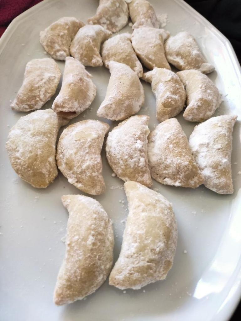 Dans chaque cercle, déposez une boule de pâte d’amande, repliez le cercle en deux, soudez bien en appuyant avec vos doigts sur les bords, Donnez la forme d’un croissant.