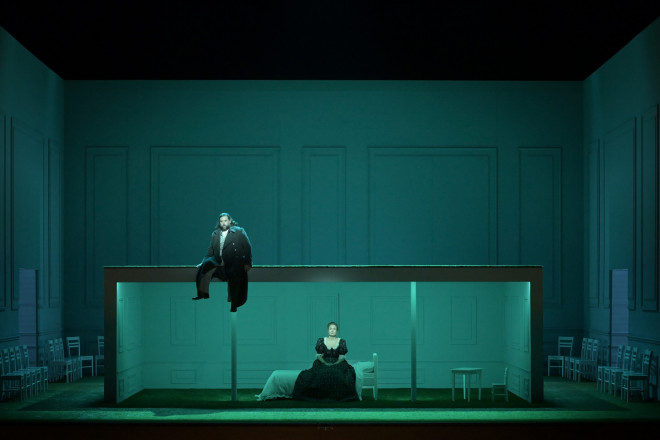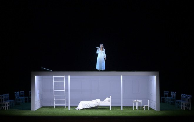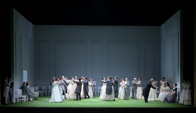 Cette version est un choc visuel : on aime ou on n’aime pas du tout. Le rideau se lève et nous découvrons le mur brut du fond de la scène et un gazon vert qui semble fatigué. Ce gazon va rester présent pendant deux actes et c’est, sans aucun doute, trop. Une chambre surgit du sol via une trappe, elle aussi son sol est en gazon et les deux poteaux encadrant le lit de Tatiana, font penser à une cage de goal au football. C’est vert, très vert, trop ? De plus, la figuration effectuée par le chœur de l’Opéra de Bordeaux qui ne démérite pas dans les chants, surprend surtout en effectuant une ‘ola’ comme au football donc…