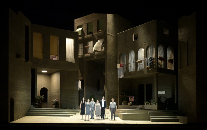 Don Giovanni, mis en scène par Ivo Van Hove, revient à Paris. Il a été créé en 2019 à Garnier, il a déménagé pour Bastille. Sans doute parce que le décor gigantesque et modulable imaginé par Jan Versweyveld convient mieux à l’immense plateau de Bastille. Ce décor, visible dès l’entrée en salle, qui rappelle les villes du sud ensoleillé et leurs ruelles sombres, est doté de superbes éclairages et de nombreux espaces sont utilisés dans les maisons pour le déroulé de notre histoire. Cependant l’ensemble est un peu terne visuellement car il y a peu de touche de couleur, tout comme comme dans les costumes des protagonistes dans les tons neutres. Hormis deux scènes magnifiques où la couleur explose, le reste demeure bien fade. Cela colle particulièrement bien à l’empreinte imposée par le metteur en scène à ce Don Giovanni, sombre et brutal. il faut noter que le casting des chanteurs a changé dans sa presque totalité.