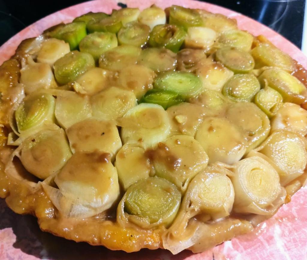 Disposez les rondelles de poireaux debout et bien serrées sur le caramel. laissez un petit espace tout le long du bord du moule pour y glisser la pâte.