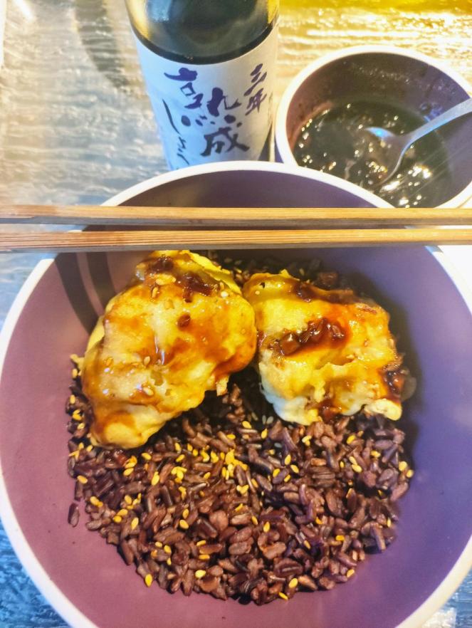 Dressez vitre assiette avec le riz les beignets recouverts de la sauce et parsemez de graines de sésame.