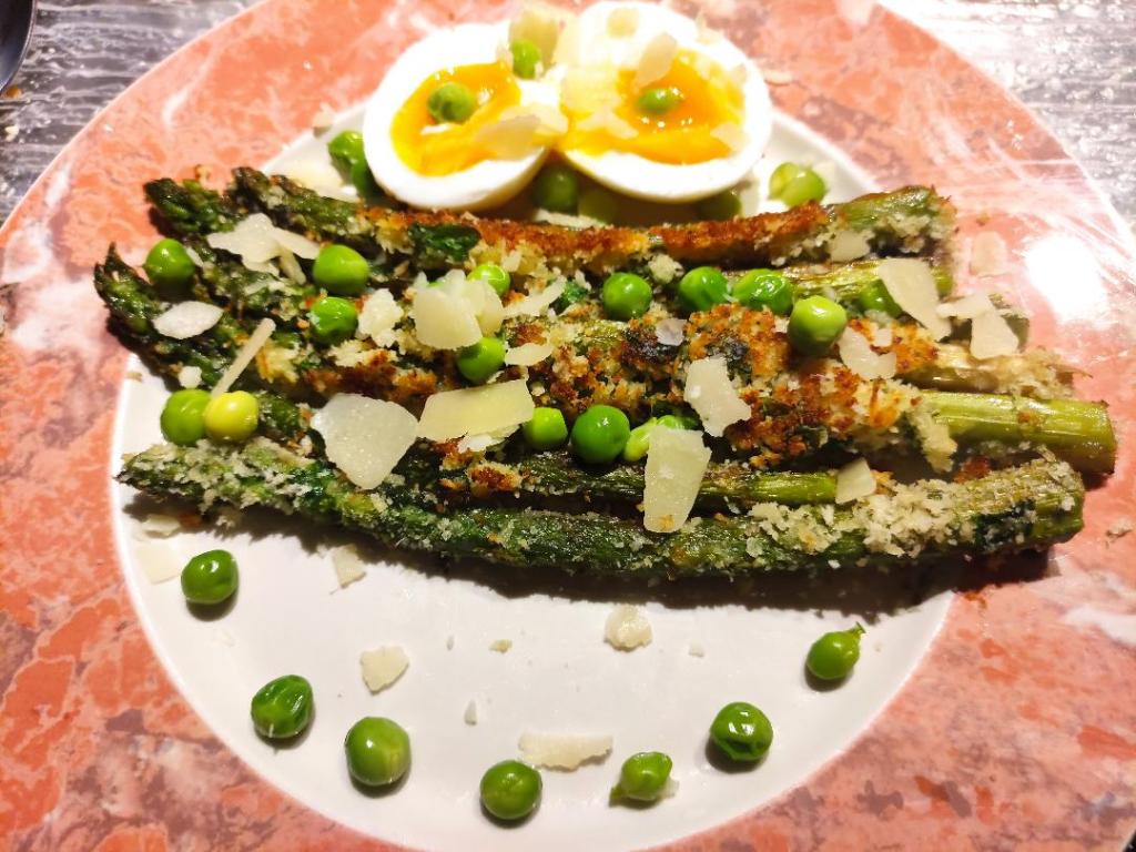 Dans une grande poêle antiadhésive, chauffez à feu moyen/fort un filet d’huile d’olive. Déposez les asperges et laissez cuire 3/4 minutes, retournez les asperges sur l’autre face et saupoudrez avec la moitié du mélange à base de chapelure. Laissez 3/4 minutes. retournez une dernière fois les légumes délicatement et versez le reste de chapelure. Quand la chapelure est bien grillée. dressez vos assiettes : fagots d’asperges, recouvert de chapelure, œuf coupé en deux et poser des petits pois et des copeaux de fromage comme vous le souhaitez.