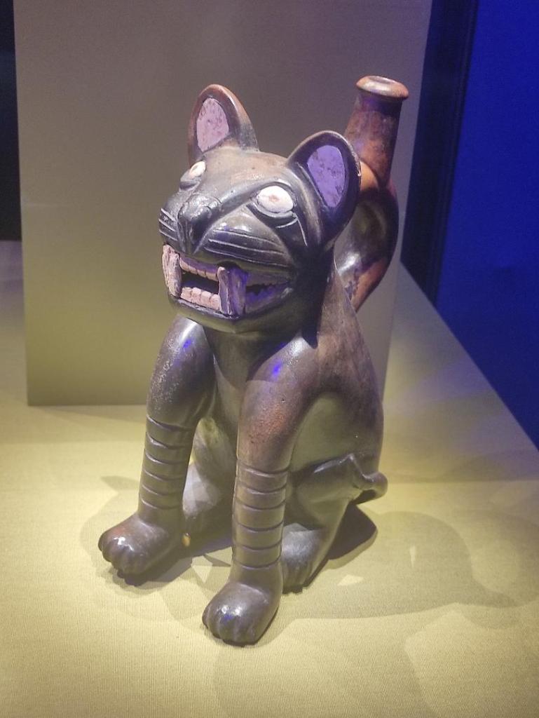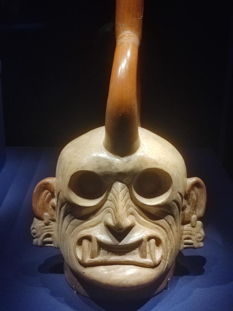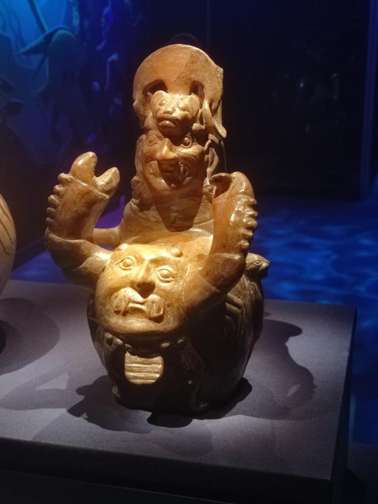 Nous découvrons sur des bouteilles très bien conservées des dessins gracieux où les chamans pouvaient grâce à des plantes psychotropes interagir entre les 3 Mondes et comment grâce à eux, Aï Apaec a su se transformer entre hybride mi-animal mi-humain pour affronter les épreuves qu’il doit franchir.
