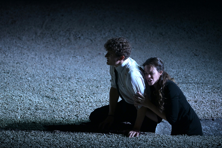 Acte un : c’est l’enterrement d’Eurydice dans une morne plaine grise qu’il est difficile à apprécier sur le moment mais qui semble parfaite après réflexion. Jakub Józef Orliński semble un peu faible mais les positions, à genoux ou allongé par terre, ne doivent pas favoriser sa voix d’ange. L’arrivée d’Amour (la splendide Elena Galitskaya) le fait se relever, prêt à affronter les Enfers.