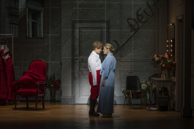 Inspiré du très controversé Mariage de Figaro de Beaumarchais de 1778, c’est en 1786 que Mozart travaillera avec l’abbé Da Ponte comme librettiste, pour une première collaboration ensemble, sur cet opéra en atténuant certes le propos polémique de la contestation populaire qui couve (3 ans plus tard la Révolution Française aura lieu). C’est un succès dès les premières représentations et qui ne se démentira pas jusqu’à nos jours. A l’heure du ‘Me Too’, la metteuse en scène Netia Jones a choisi de transposer l’action de nos jours dans les coulisses même de l’Opéra Garnier mettant l’accent sur le harcèlement sexuel (dès l’ouverture, le Comte apparait comme un prédateur à l’encontre d’une jeune ballerine, les affiches de protestation contre le harcèlement). C’est elle aussi qui est en charge des costumes, des vidéos et des décors. Lors de la première partie, nous voyons simultanément ce qu’il se passe dans trois loges de l’opéra. Il y a beaucoup à voir sur le plateau, l’action s’étalant souvent d’une loge sur l’autre car elles ont des portes communicantes qui s’ouvrent à la volée comme dans du théâtre de boulevard. Les deux premiers actes passent très rapidement (1h35) car nous sommes très sollicités visuellement de toute part, néanmoins cela peut destabiliser certains spectateurs, surtout s’ils doivent en plus lire les sur-titres. Après l’entracte, l’action est sur un plateau unique où nous suivons comment la vérité sur le Comte va éclater.