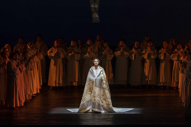 Le chœur de l’Opéra de Paris, préparé par Ching-Lien Wu, a un rôle particulièrement important, très présent sur scène en tant que soldats, paysans, moines, mendiants, vieillards. Il propose une base solide sur laquelle s’appuie les chanteurs. La direction musicale de Jader Bignamini est assez puissante, elle met en avant les instruments à vents au détriment des cuivres.