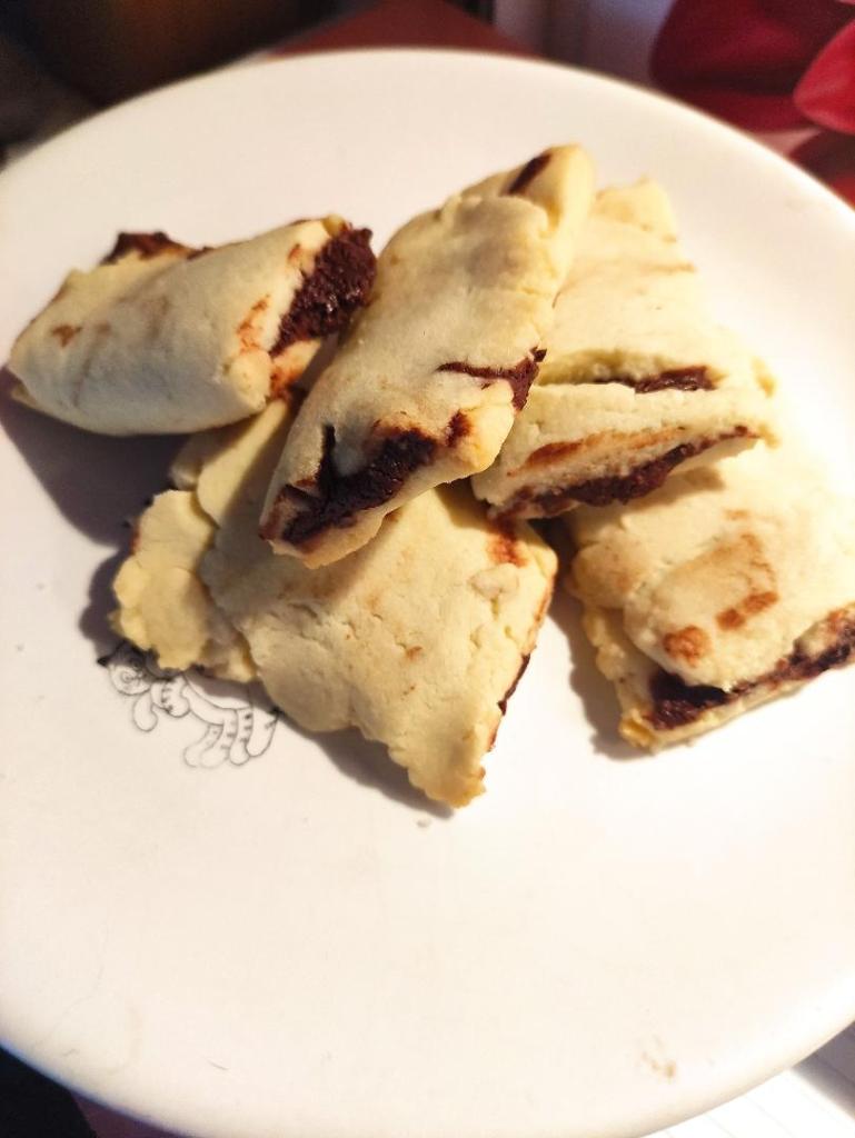 Faire fondre le chocolat au bain marie, puis ajoutez l’huile et la poudre de noisette. Mélangez bien. Puis étalez la pâte chocolatée sur les bandes de pâte en laissant un peu de bord sans chocolat. Repliez les bandes sur elles mêmes en appuyant légèrement sur les bords. coupez ensuite des tronçons de 5 cm.