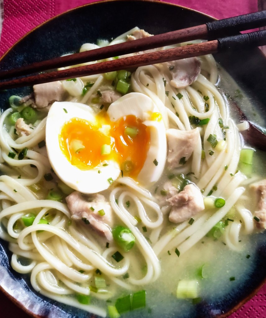 Mettez le bouillon de volaille à chauffer jusqu’à petite ébullition puis versez les cubes de viandes et laissez cuire 7 minutes avant de monter le feu pour obtenir une franche ébullition et ajoutez les udon pour 4/5 minutes (selon ce qui est indiqué sur l’emballage)