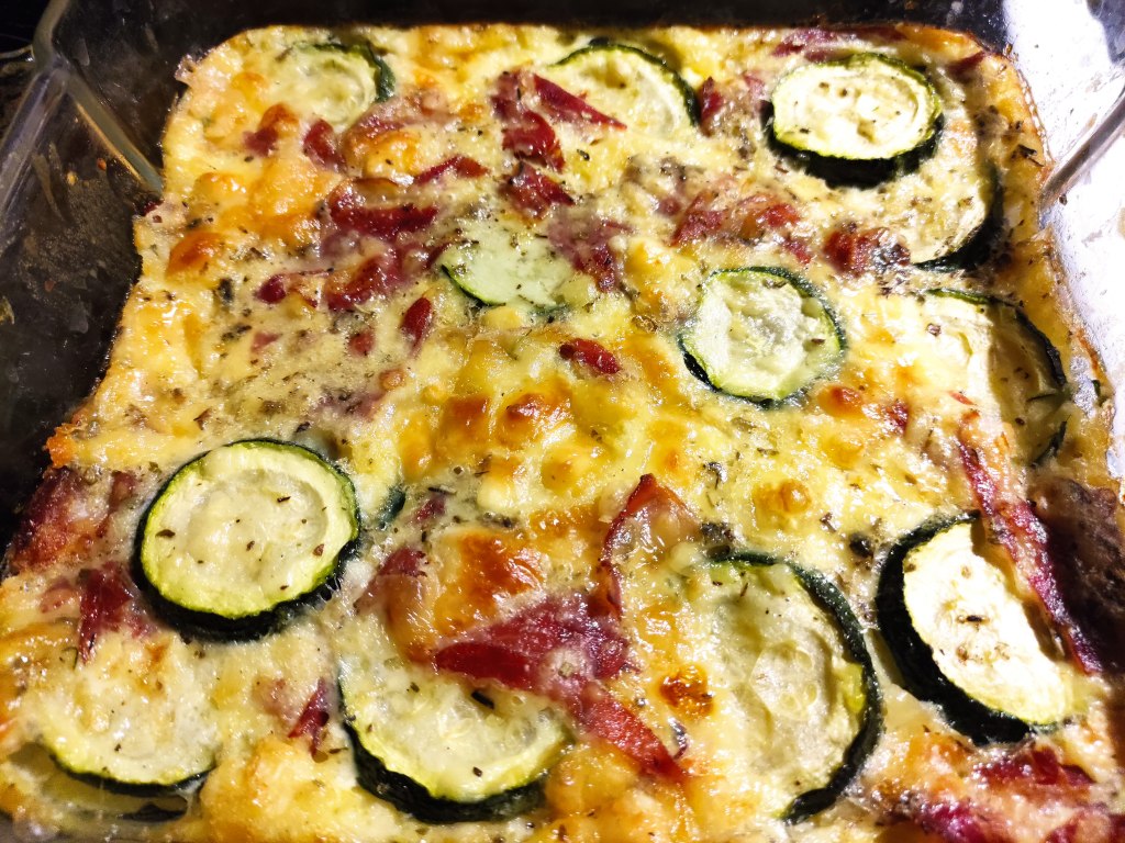 Beurrez un moule à gratin. Versez les courgettes dans le plat puis ajoutez le lard ou les poivrons.