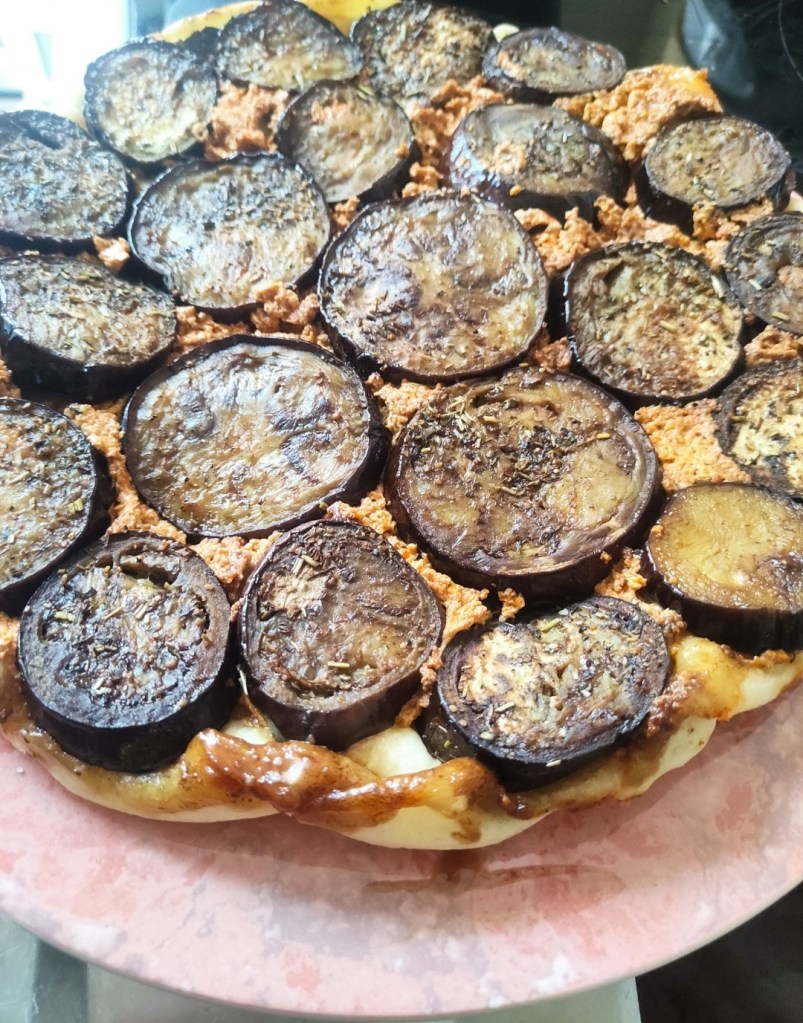 Sortir la pâte du frigo. Etalez la pâte au rouleau (si c’est celle au parmesan), il faut qu’elle soit assez fine et étalez dessus le mélange fromage + pesto rouge. Posez la pâte sur les aubergines de manière à pouvoir border le tour afin que ça forme un rebord à l’intérieur du moule.