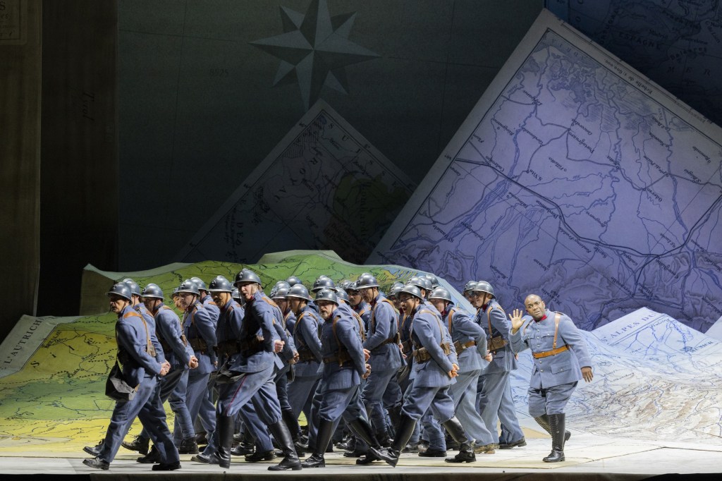 C’est en 1840 que Gaetano Donizetti créé cet opéra-comique en deux actes et en français. C’est en 2007 à la Royal Opera House de Londres que Laurent Pelly a créé cette version énergique et facétieuse avec les superbes décors de Chantal Thomas. Certes il change les uniformes napoléoniens du livret d’origine en tenue de poilus de la guerre 14/18 et adapte (modernise) les dialogues avec Agathe Mélinand mais sans que l’histoire soit dénaturée. L’histoire est mouvementée, on n’a pas le temps de s’ennuyer.