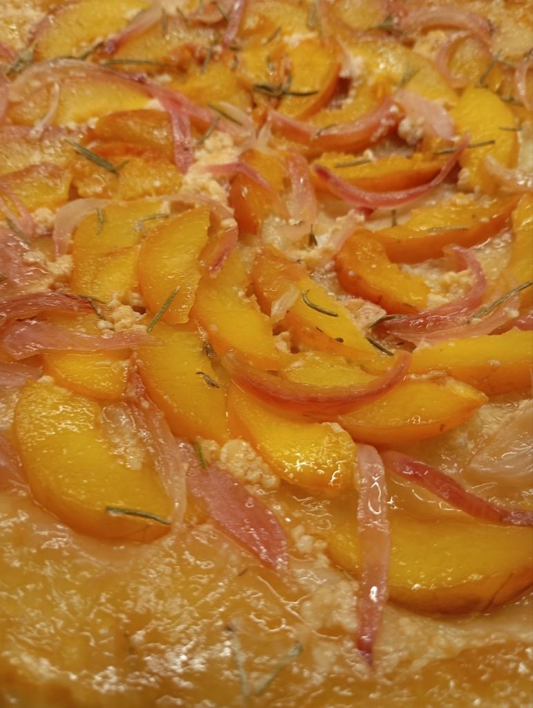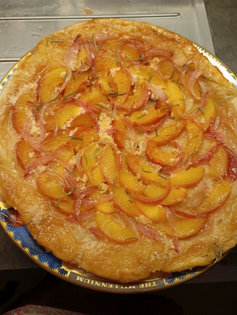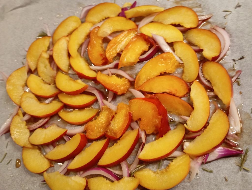 Disposez en cercle des tranches de nectarines, puis des oignons rouges et parsemez de fêta émiettée.