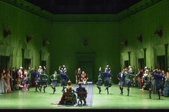 Le canadien Robert Carsen propose une version particulièrement réussie de cet opéra. On ne peut s’empêcher de penser à la demeure royale de Balmoral en Ecosse que ce soit pour la salle de bal (et ses danses magnifiques), le bureau du roi ou les alentours. Bien que la couleur verte soit omniprésente (mur, sol, portes) et peut surprendre le spectateur lors des levers de rideau, le résultat est flatteur grace à une mise en lumière où le canadien est partie prenante avec Peter van Praet, il distille son gout pour le baroque avec un esthétisme choisi avec soin. Les changements de décors sont opérés pendant les solos vibrants des chanteurs qui viennent sur l’avant scène, un rideau (vert aussi) descend derrière le chanteur laissant ainsi libre le plateau pour ses changements. Du vert, il y en aussi sur les kilts des chanteurs et des figurants. Le public ne s’y trompe pas et ovationne longuement à fin du spectacle tous les participants.