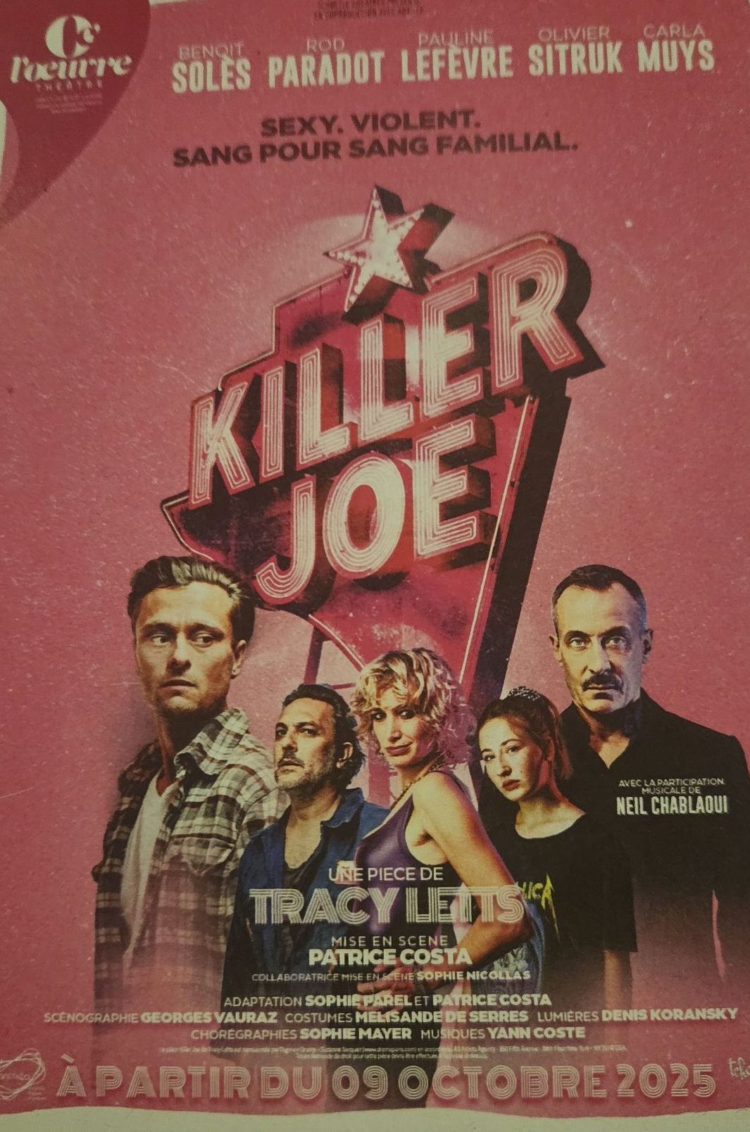 C’est la première fois qu’il y a une adaptation française de Killer Joe, la pièce de Tracy Letts écrite en 1991. Pièce culte aux Etats Unis où le trash vient flirter avec la réalité à maintes reprises. Elle sera jouée en 1993 et la pièce prendra un tel essor qu’un film en sera tiré et réalisé par William Friedkin. Le rôle du tueur sera joué par Matthew McConaughey.