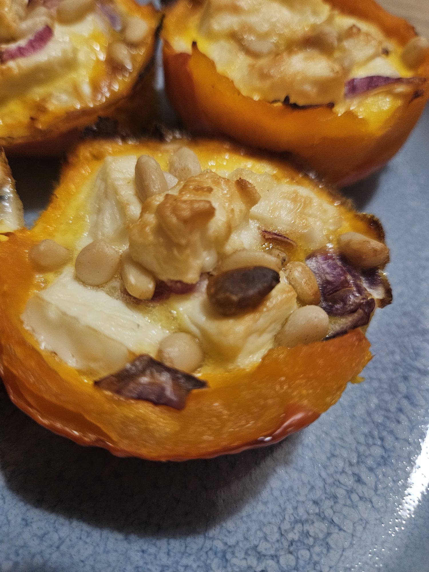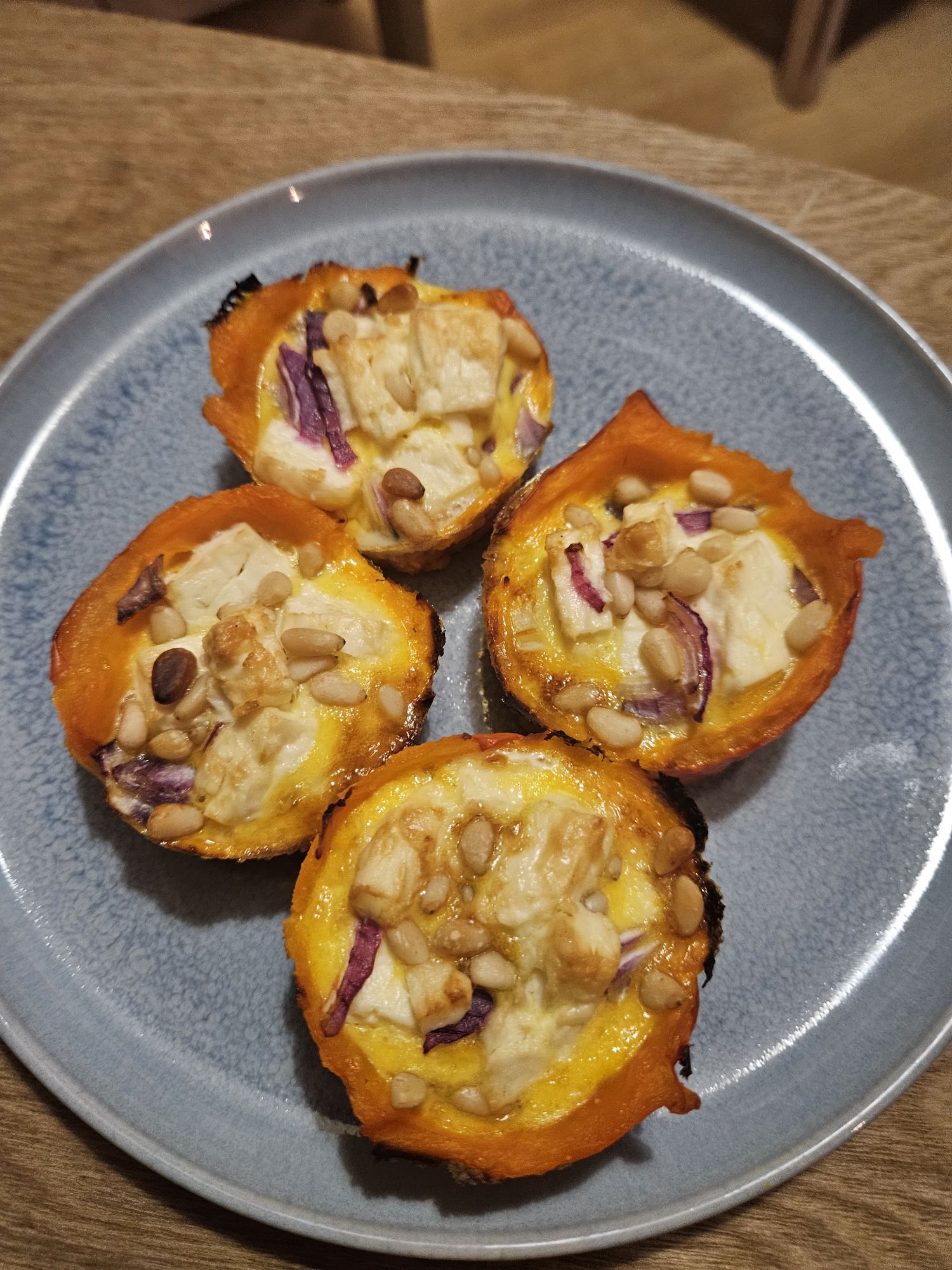 A l’aide d’une cuillère à soupe répartissez l’omelette sur les potimarrons, puis disposez les cubes de fromages, les oignons et les noix ou les pignons de façon à ce que sur le dessus du muffin, on voit un peu de chacun des ingrédients.