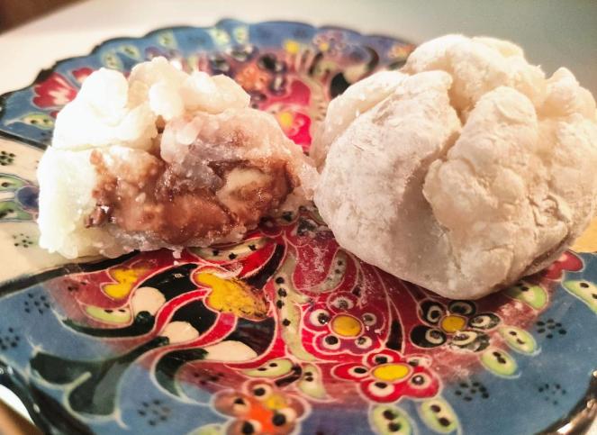 Revenez à la pâte refroidie, coupez la pâte en 8 parts égales. Prenez un morceau de pâte et aplatissez le en cercle avec la paume de la main légèrement humide sur un plan de travail couvert de fécule de maïs ( si la pâte est en petits morceaux qui ne collent pas entre eux, trempez la main dans un bol d’eau mettez la pâte dans votre main et roulez la puis aplatissez la dans la fécule de maïs) puis mettre en son centre une noisette de pâte d’amande. Refermez le mochi en rapprochant les bords, pour aider à la suture, on mouille le bout des doigts qui appuient. Puis roulez le mochi entre vos mains pour façonnez la forme de la boule (personnellement je ne fais pas cette étape). Roulez dans la fécule de maïs généreusement.