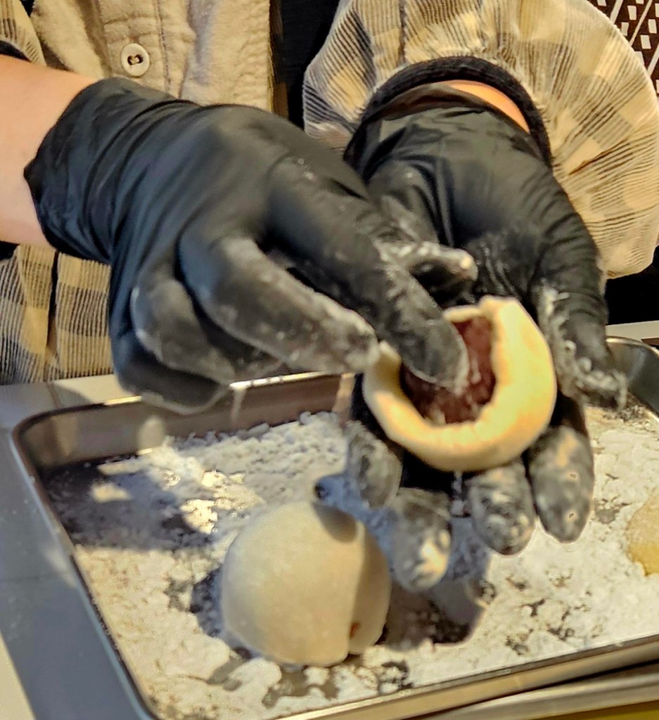 Travaillez chaque portion en l’aplatissant en cercle, puis déposez une boule d’anko et enroulez là de pâte. Pincez pour fixer la pâte et roulez les boules dans la main pour obtenir une jolie forme arrondie.