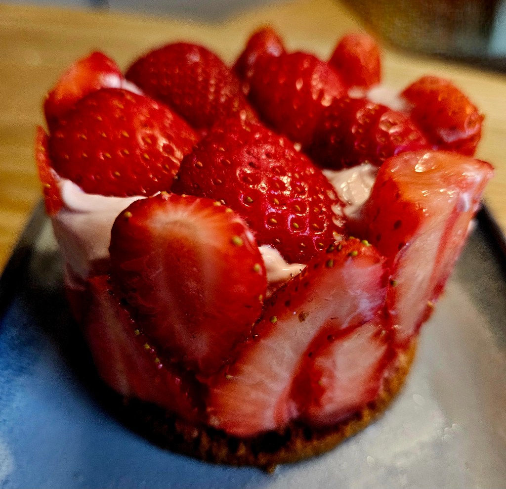 Ajoutez de la crème puis décorez les dessus avec les fraises restantes ( taillées en éventail par exemple)